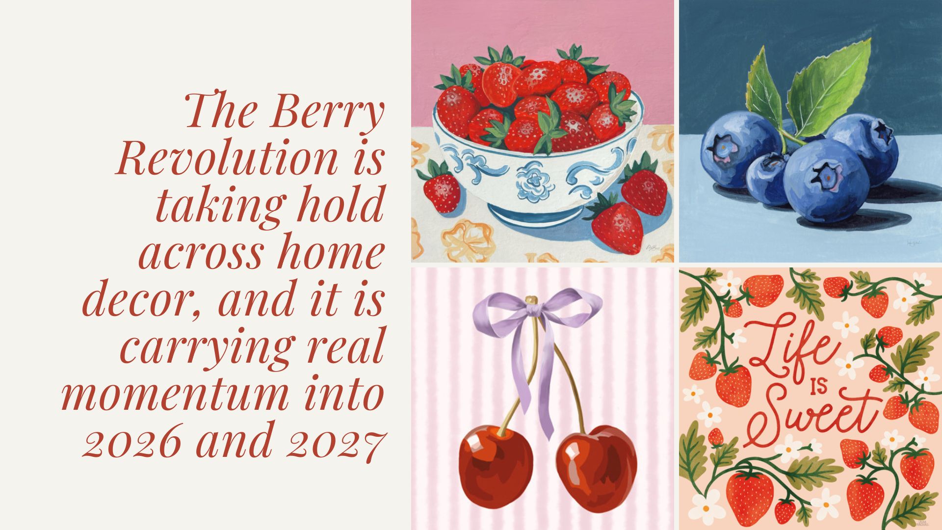 The Berry and Cherry Revolution is shaping art licensing for 2027 through a combination of rich color, playful motifs, and a broader shift toward expressive interiors. Deep berry tones like plum and claret are emerging as key colors, while strawberries, cherries, and blueberries are driving a recognizable, versatile design direction.