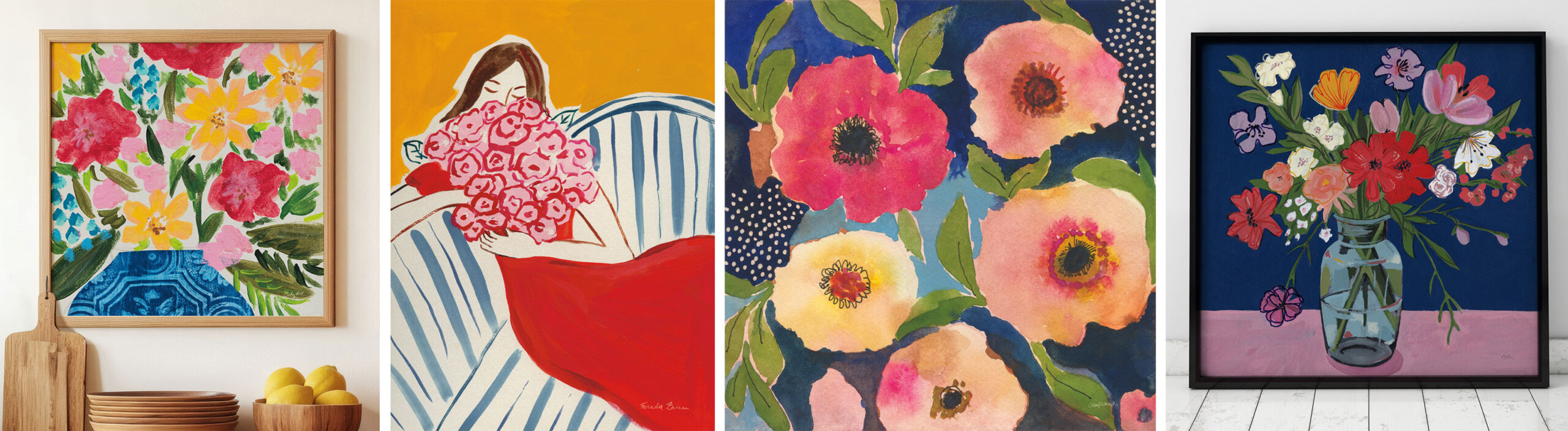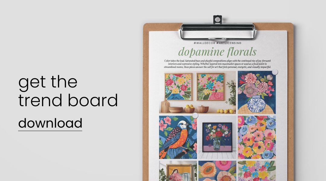 Saturated hues and playful compositions align with the continued rise of joy-forward interiors and expressive styling. Whether layered into maximalist spaces or used as a focal point in streamlined rooms, these pieces answer the call for art that feels personal, energetic, and visually impactful.