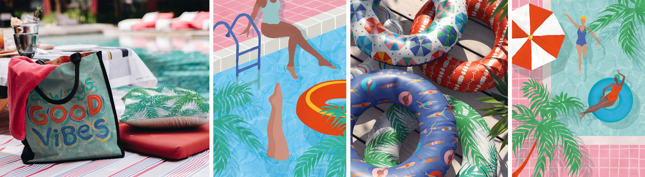 Overhead pool views and simplified figures tap into the ongoing love of stylized travel and leisure motifs. This direction feels optimistic, social, and highly giftable across wall art, textiles, and accessories. It is summer, curated.